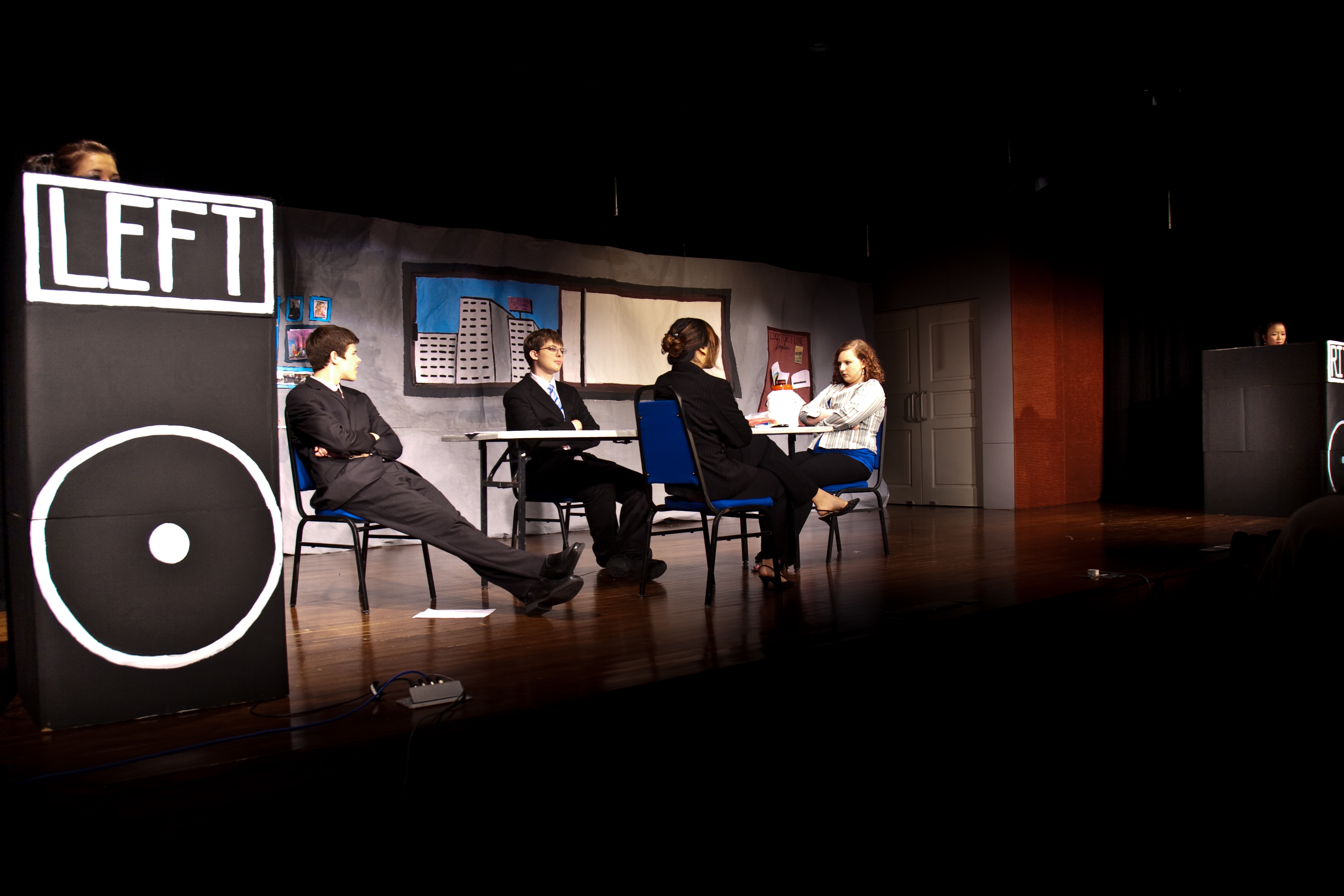 In this scene, Aubrey (middle right) is getting ready to lose her job as she will shortly lose control and attack her former fiance Humphries (middle left). Rebecca (LEFT) and Beth (RITE) are the two stereo speakers who provide the soundtrack to Aubrey’s life.