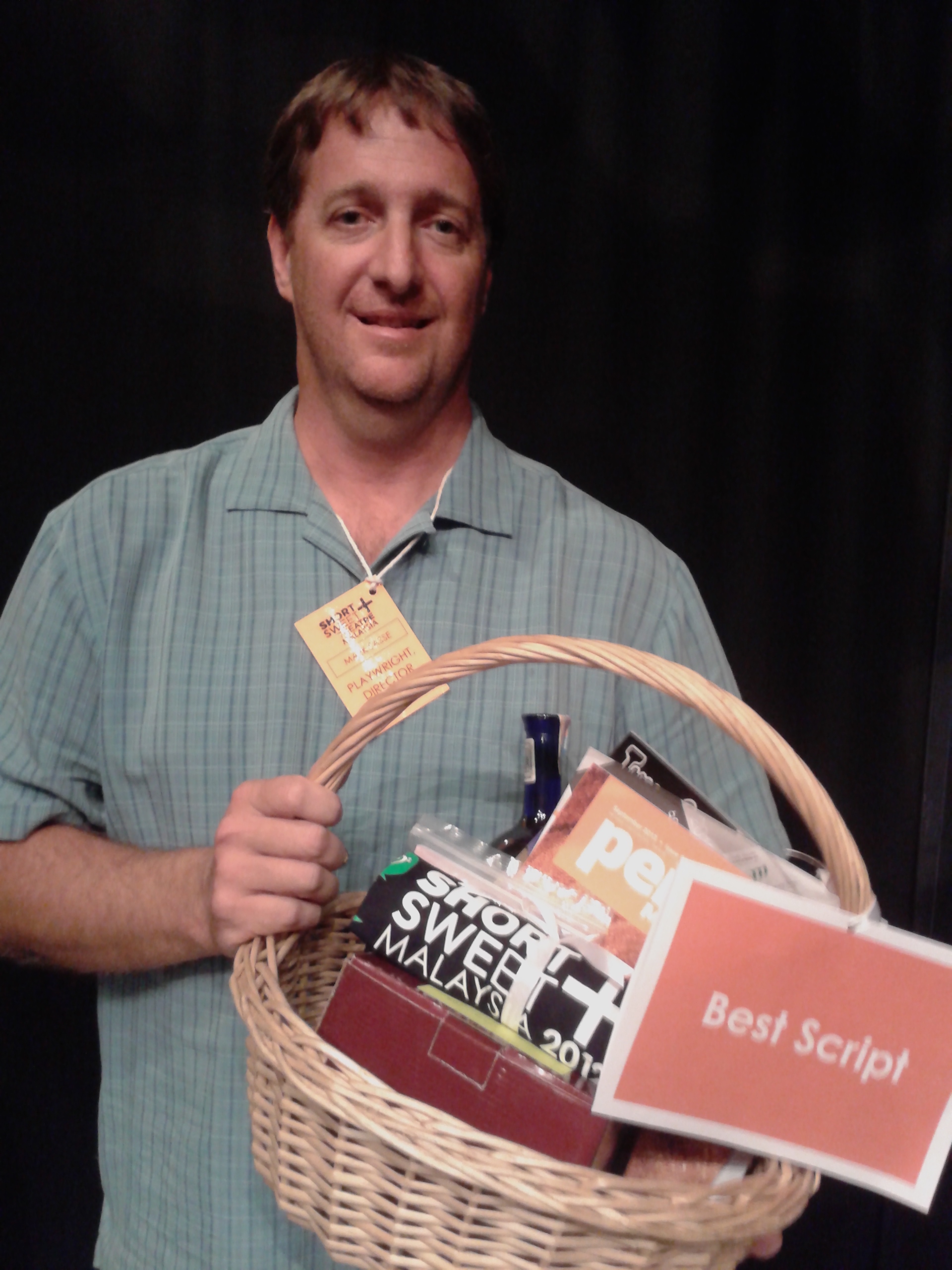I originally wrote the script “‘No’ in Spite of Itself” as a dramatic sketch for my drama troupe The RLT Players, and it will be a part of our new show debuting in November called “Captured in Time & Space.” I decided to send the script in to Short & Sweet and it was accepted for production. Now its an award winner. The script itself is about a man name Nat who stands on the edge of a cliff contemplating all the trouble he has in his life. His alter ego comes up from behind to discuss everything with him only to be finally forced to confront the main issue in his life – loving a girl who doesn’t love him back. Here’s the proud father.