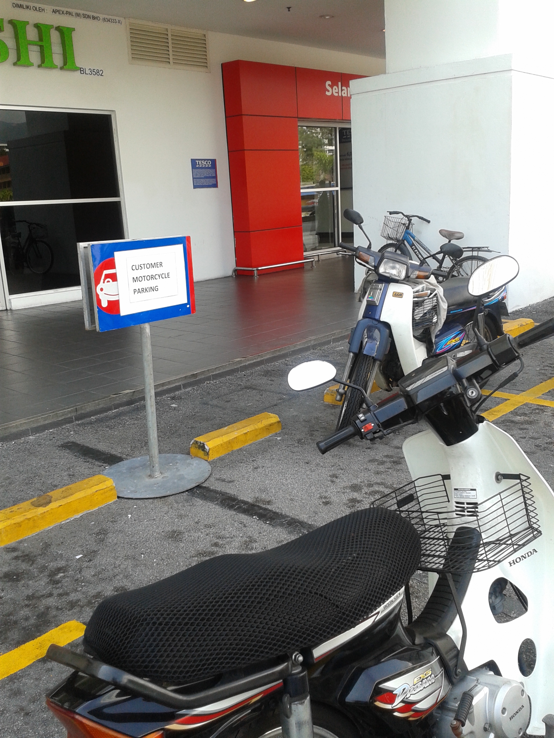 Undaunted, the cheeky motorcyclists started parking in a new spot – directly in front of the front door. Yes, directly in front, as in you would have to walk through a sea of motorbikes to walk into the door. Tesco tried to combat that with “No Parking” signs, but apparently Penang motorcyclists don’t like to walk and don’t know how to read. The signs did nothing to prevent them from parking there.