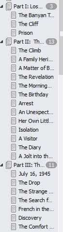 Yeah, like that would ever happen. Here’s a snippet from the Scrivener binder of my new novel, The Reach of the Banyan Tree. It gives a sneak peek of my chapter titles: