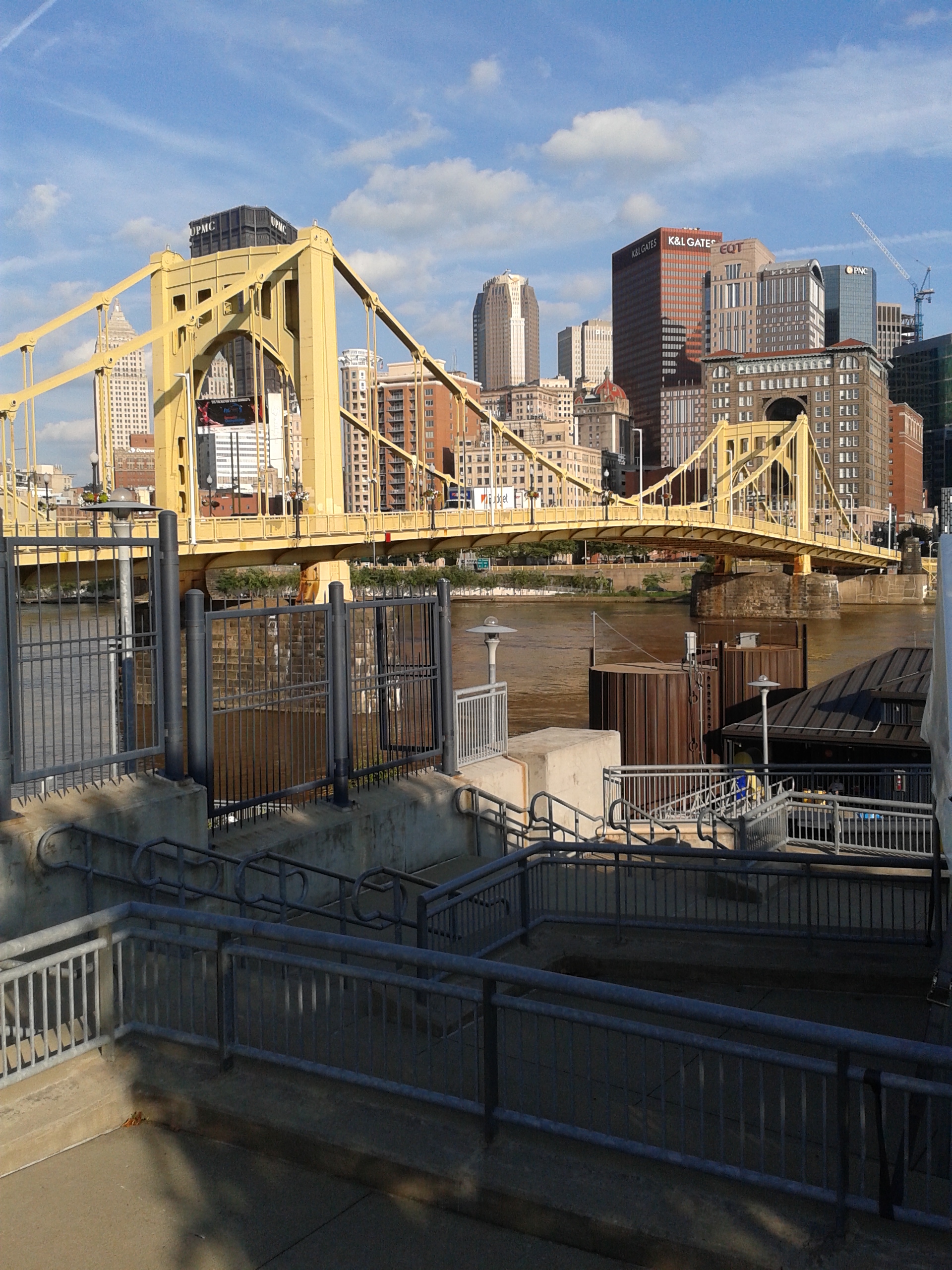 The beautiful Roberto Clemente bridge rises right out of the outfield and crosses the Allegheny River into downtown. The bridge is closed for all but foot traffic on game days.