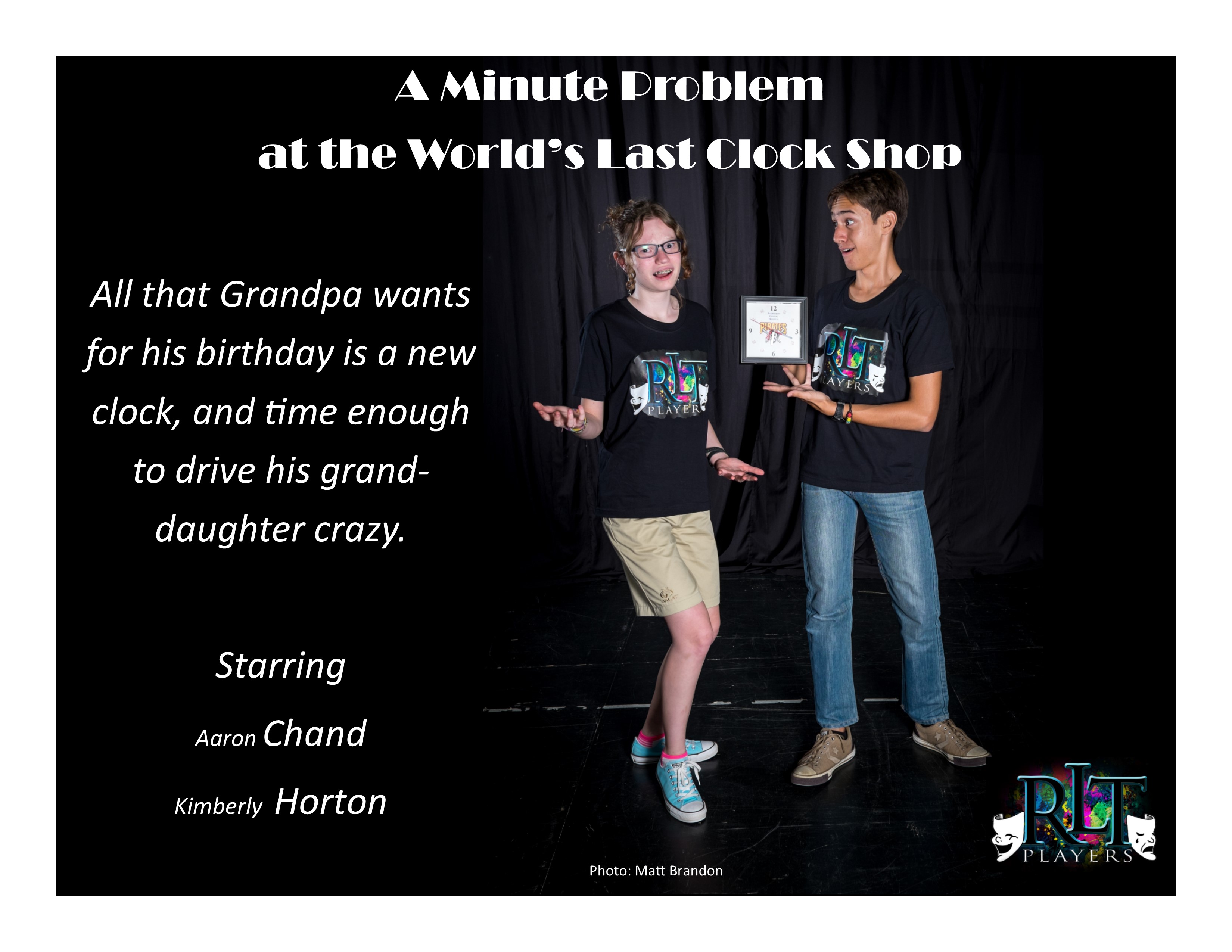 This is one of those mostly meaningless fun scripts which are full of bad puns and lots of cheap laughs. In many ways, it almost strays into kids’ theatre with crazy gestures, yelling, running around, and lots of confusion. The premise is simple. A grandpa sets a trap for his granddaughter simply to drive her crazy. I thought of this when I was checking out at a superstore one day, staring at a clock shop. Bad pun after bad pun related to time kept flowing through my brain, so I decided to make a crazy little play about it. Our actors are hilarious in this one.