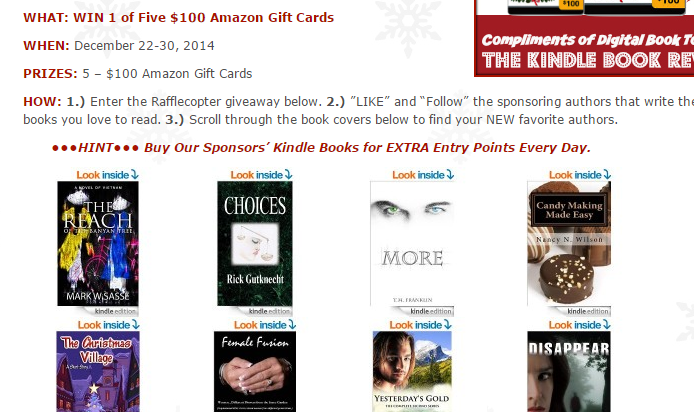 Now I’ve partnered up with the Kindle Book Review – giving away five $100 Amazon Gift Cards to the lucky winners. Plus, you can help promote my latest novel, “The Reach of the Banyan Tree.” And a purchase of “Banyan Tree” gives you more opportunities to win. Here I am, leading the pack for this promotion: