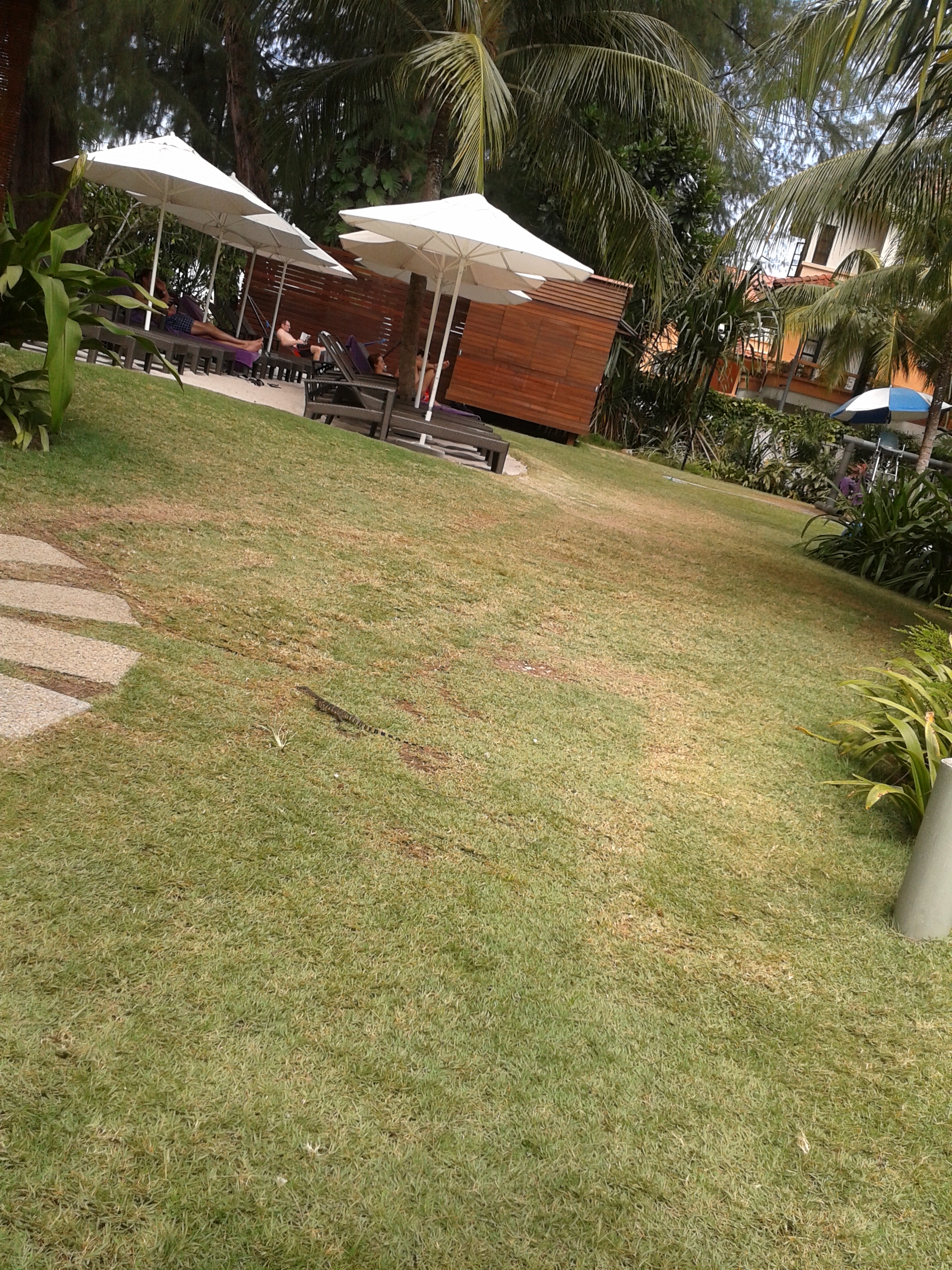 The lizard climbed the stone side and rested in the sun on the fake wood patio. I said to the guard, “It’s going to frighten someone.” He just smiled and kept looking at the beast. I kept thinking that something should probably be done, but the guard kept admiring it, like it was supposed to be there, like it was a piece of art to be cherished. I kept thinking about the foreign ladies who would scream their lungs out if they came across it in the water. .