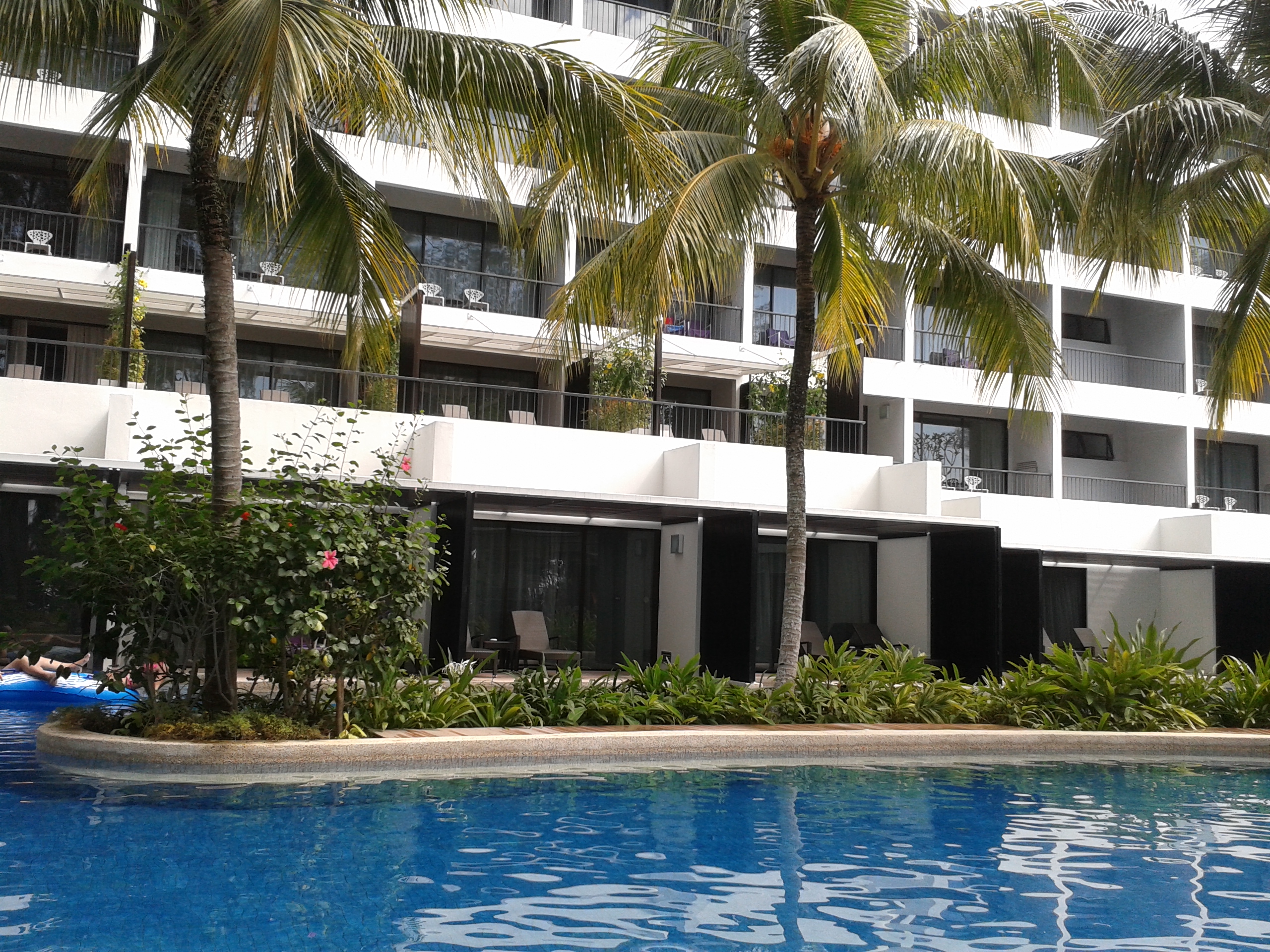 … when a rather large black and yellow lizard jumped out of the flowers and into the edge of the pool. A resort security guard was standing beside me and I pointed out the creature to him. He smiled. We watched as the lizard swam across the chlorine blue and came to the little sun-bathing island in the middle of the pool. The Island is below.