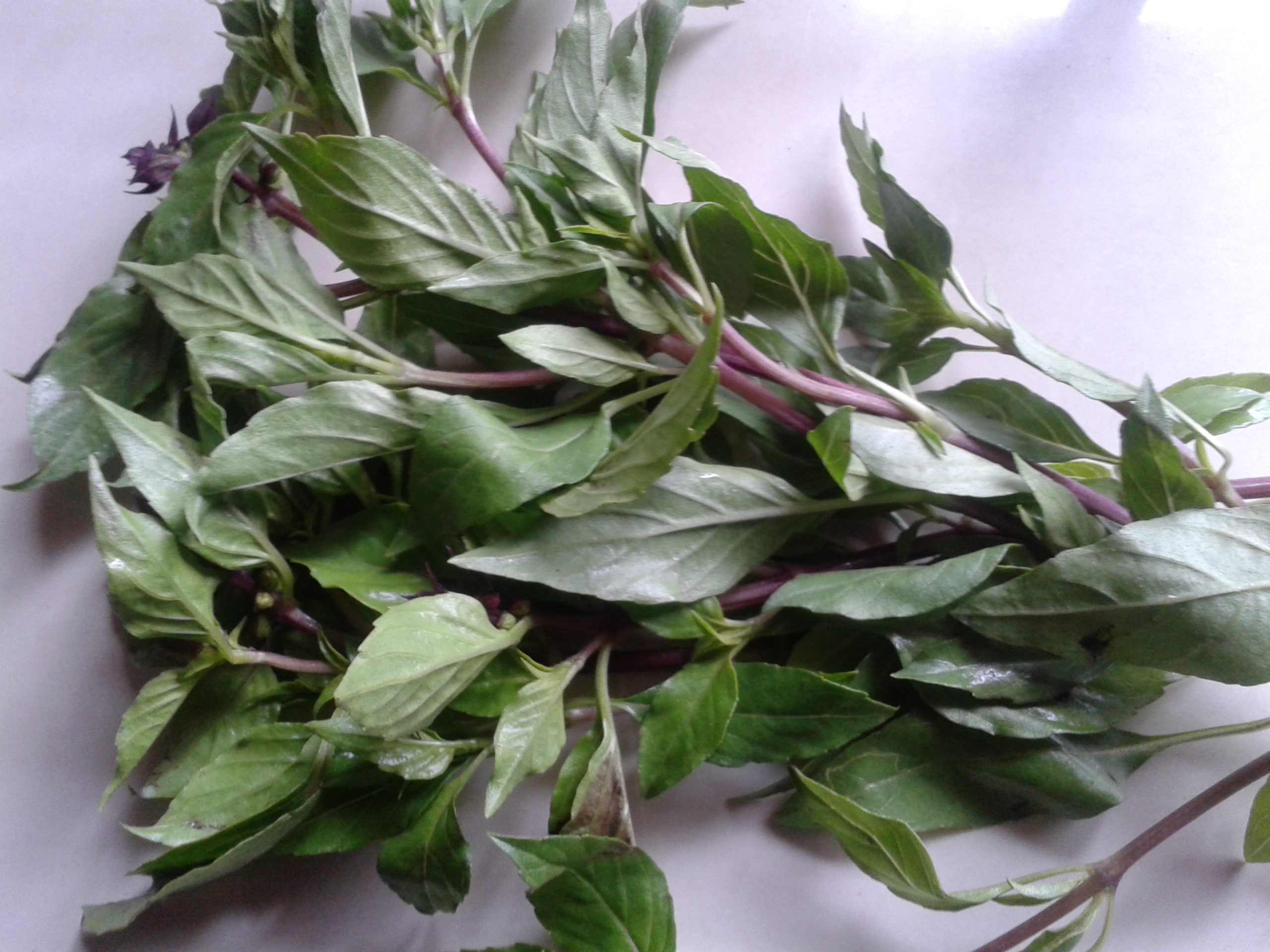 Thai basil makes itself known in a couple ways. First, its smell. Just bringing it into the house or fridge gets the minty-goodness of it fragrantly sharing itself with everyone. And if you start chopping it, get ready for comments like, “What’s that smell? It smells so good.” “Thai Basil” is the answer.