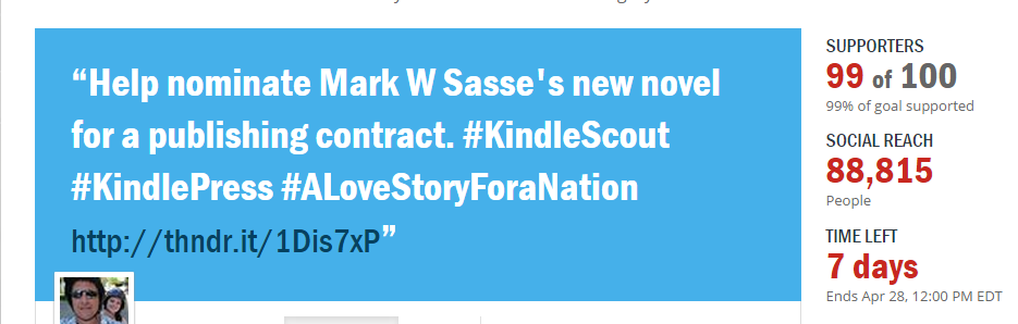 So here’s what I have done. I’ve stopped promoting my Kindle Scout page UNTIL I get enough people joined on my Thunderclap campaign that is scheduled to send the promotional blast on April 28 IF I get at least 100 people.