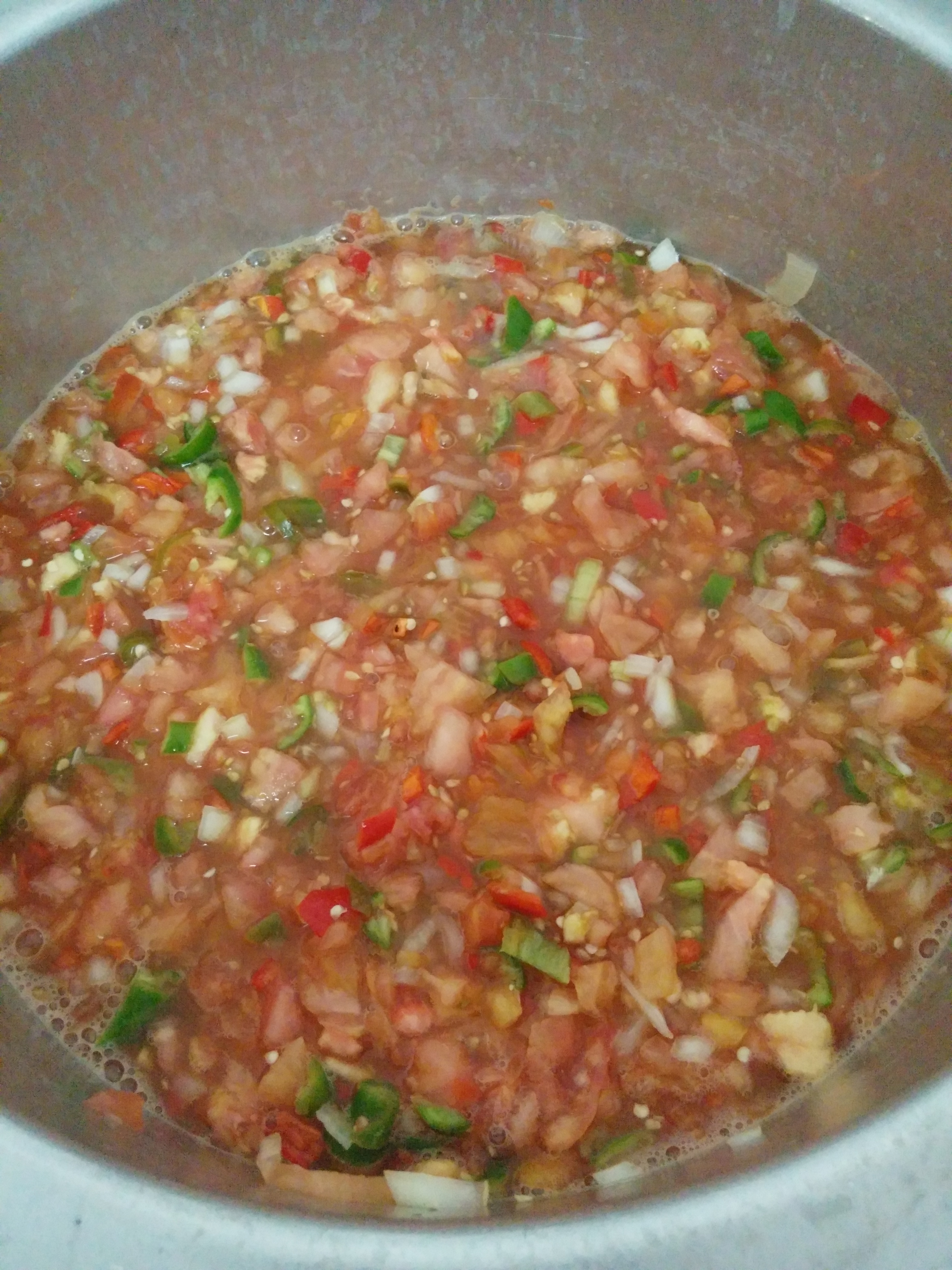 Step two: chop up a 8 kg of red, ripe tomatoes. Add more chopped peppers, onions, sugar, lime juice, salt, and top with vinegar. Here’s what it looks like: